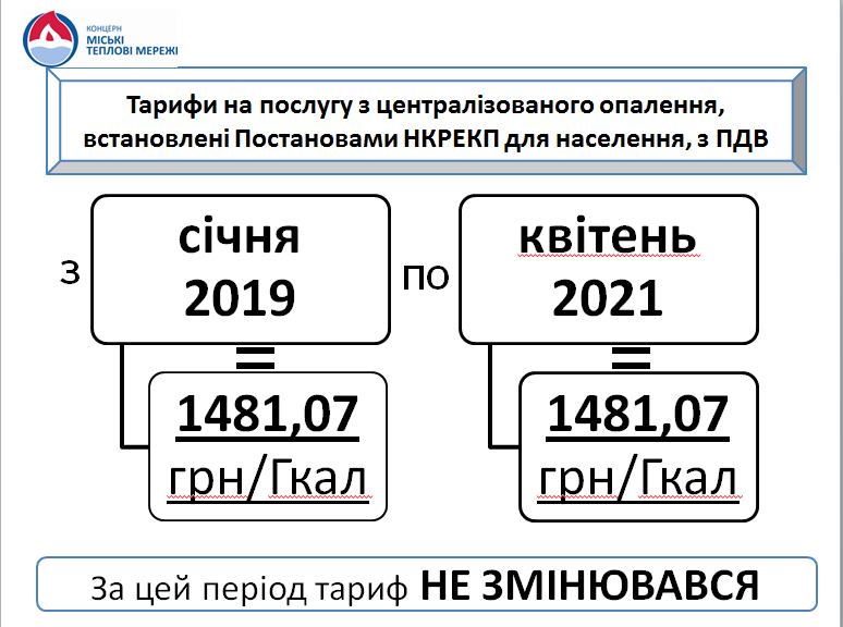 Справа в наступному: тарифи на опалення та підігрів води встановлює НКРЕКП. Останній раз тариф затверджено наприкінці 2018 року. На сьогодні він складає 1481,07 грн /Гкал з ПДВ (1234,23 грн/Гкал без ПДВ). Цей тариф стосується договорів укладених від 21 липня 2005 року.