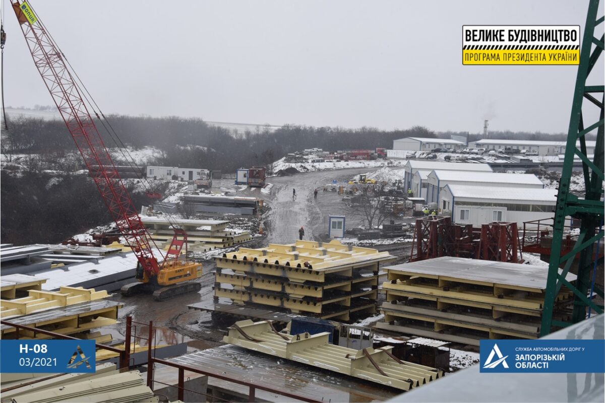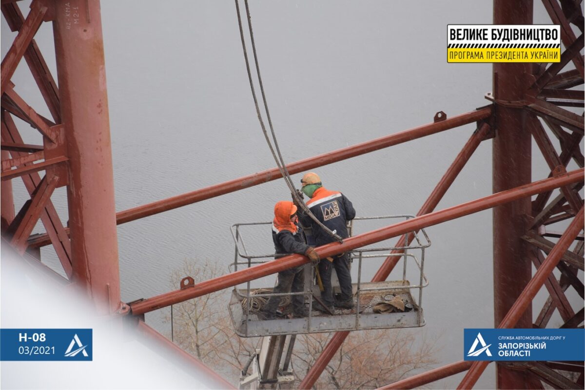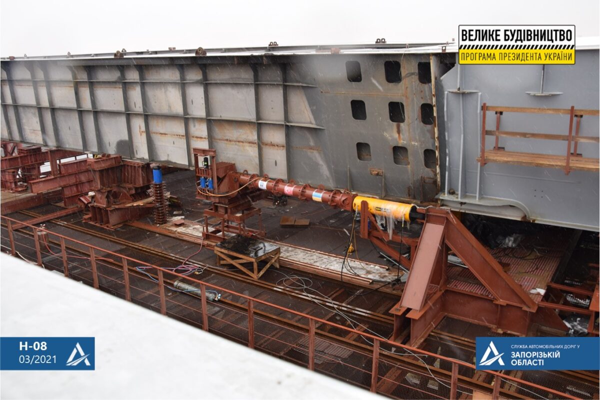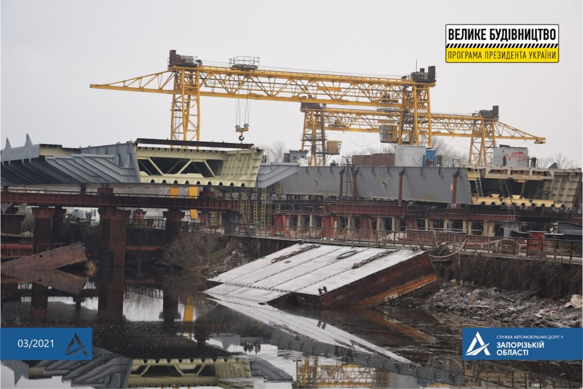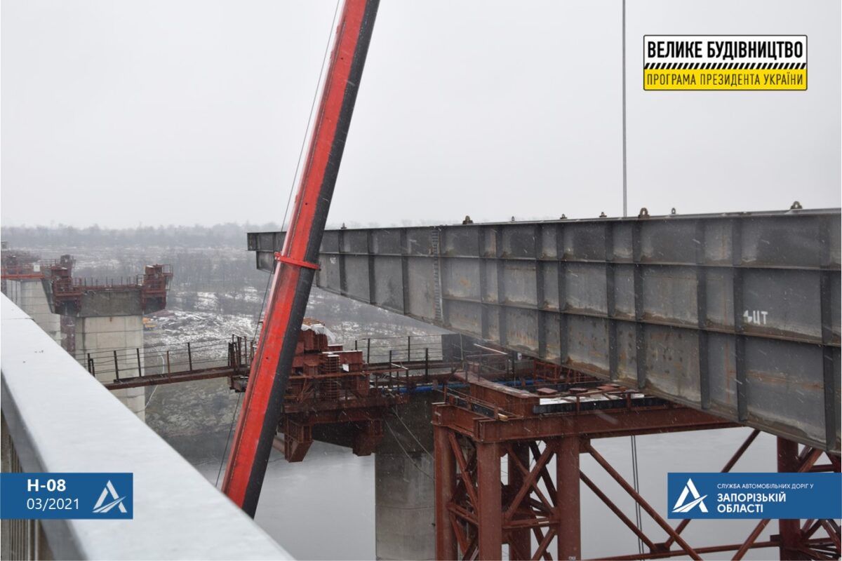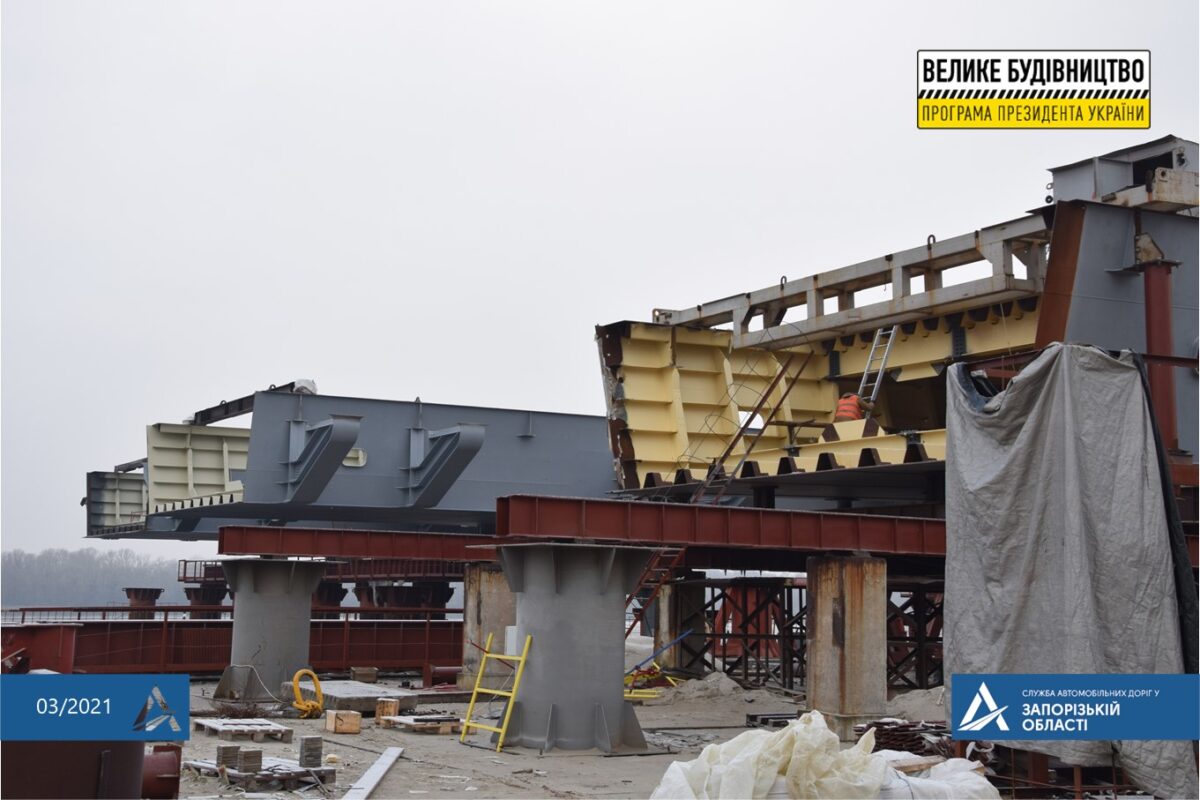 Мостобудівники відзвітували про хід робіт на вантовому мості через річку Дніпро у Запоріжжі. Станом на 26 березня, вже змонтовано коробчасту балку споруд №3 та №5 (підходів до балкового мосту), зібрали першу секцію балкового мосту та закінчили роботи з монтажу аванбеку для повздовжнього насування секцій мосту.
