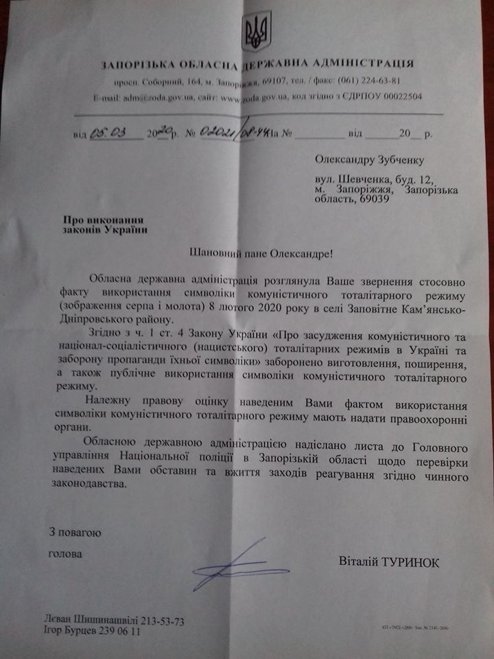 Зубченко написав, що зробив запит на ім’я очільника облдержадміністрації Віталія Туринка стосовно факту використання символіки комуністичного тоталітарного режиму під час одного з заходів в області.