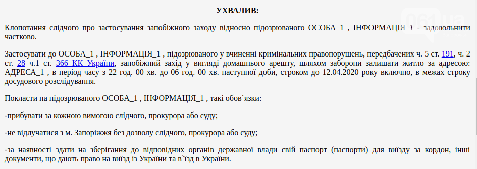 Рішенням Орджонікідзевського районного суду чиновника залишили під домашнім арештом до 12 квітня 2020 року включно з забороною покидати домівку з 22:00 до 6:00. Про це повідомляють в рішенні суду, передає 061.