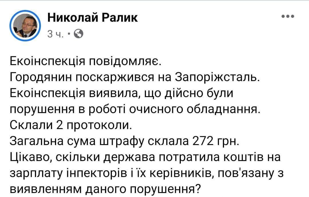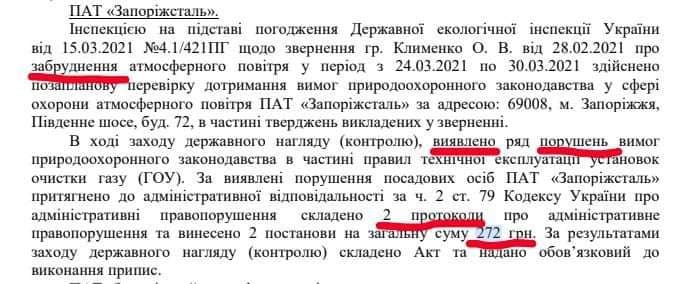 «За виявлені порушення посадових осіб ПАТ «Запоріжсталь» притягнуто до адміністративної відповідальності за ч. 2 ст. 79 Кодексу України про адміністративні правопорушення та винесено 2 постанови на загальну суму 272 грн.», — йдеться у відповіді.