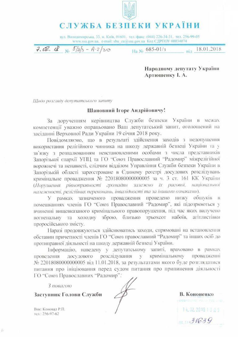 18 січня 2018 року на пленарному засіданні Верховної Ради України Ігорем Артюшенком був оголошений депутатський запит щодо необхідності перевірки діяльності окремих представників УПЦ МП та організації «Радомир». Також депутат направив Генеральному прокурору України Юрію Луценку, голові Служби безпеки України Василю Грицаку, Міністру юстиції України Павлу Петренку депутатський запит щодо злочинної діяльності окремих представників УПЦ МП та Громадської організації «Союз православний «Радомир» в м. Запоріжжя. У зверненні нардеп викладає факти, які вказують на це.