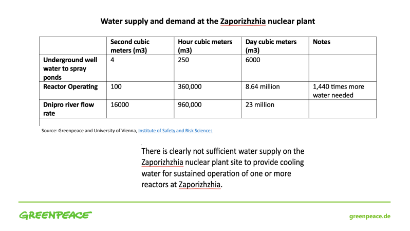 Крім того, за інформацією представників Greenpeace, на майданчику станції наразі спостерігається недостатня кількість охолоджувальної води через підрив Каховської ГЕС. За оцінками Greenpeace та експертів ядерної енергетики Віденського університету, один реактор ЗАЕС потребує величезної кількості води — 6000 тонн (куб. метрів).