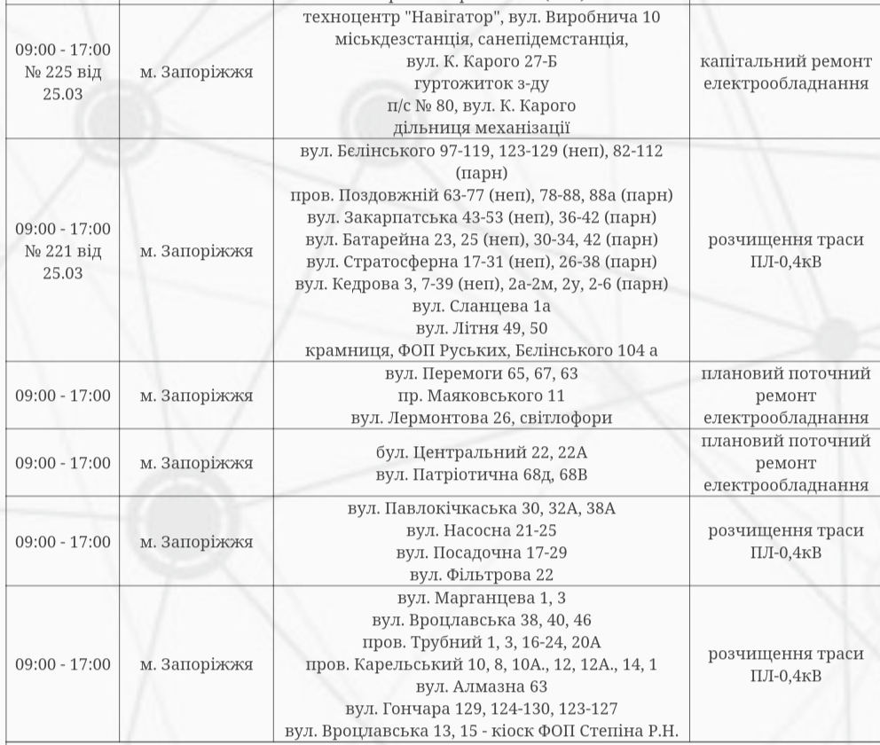 Знеструмлення обіцяють з 9:00 до 17:00, з 10:00 до 13:00 та з 12:00 до 15:00 за наступними адресами: