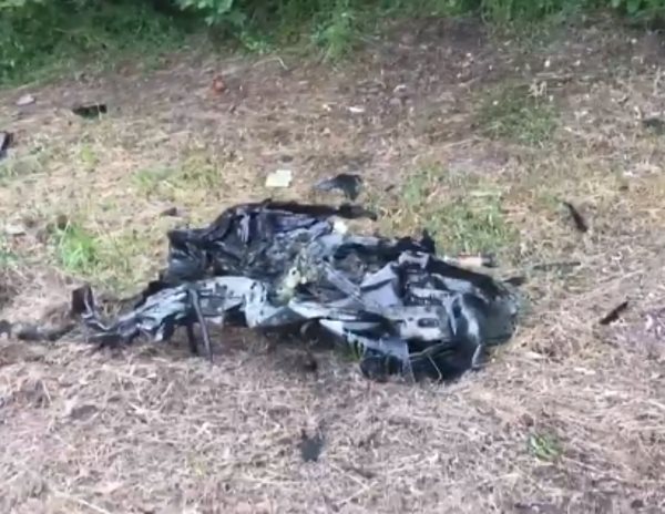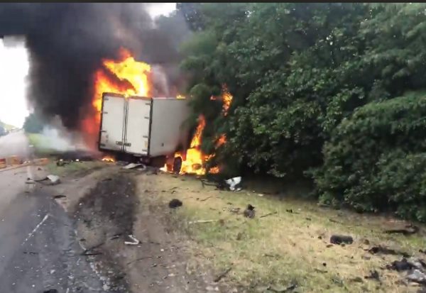 Место аварии напоминает кадры фильма ужасов, повсюду огонь, дым и разбросаны детали кузовов обоих транспортных средств.