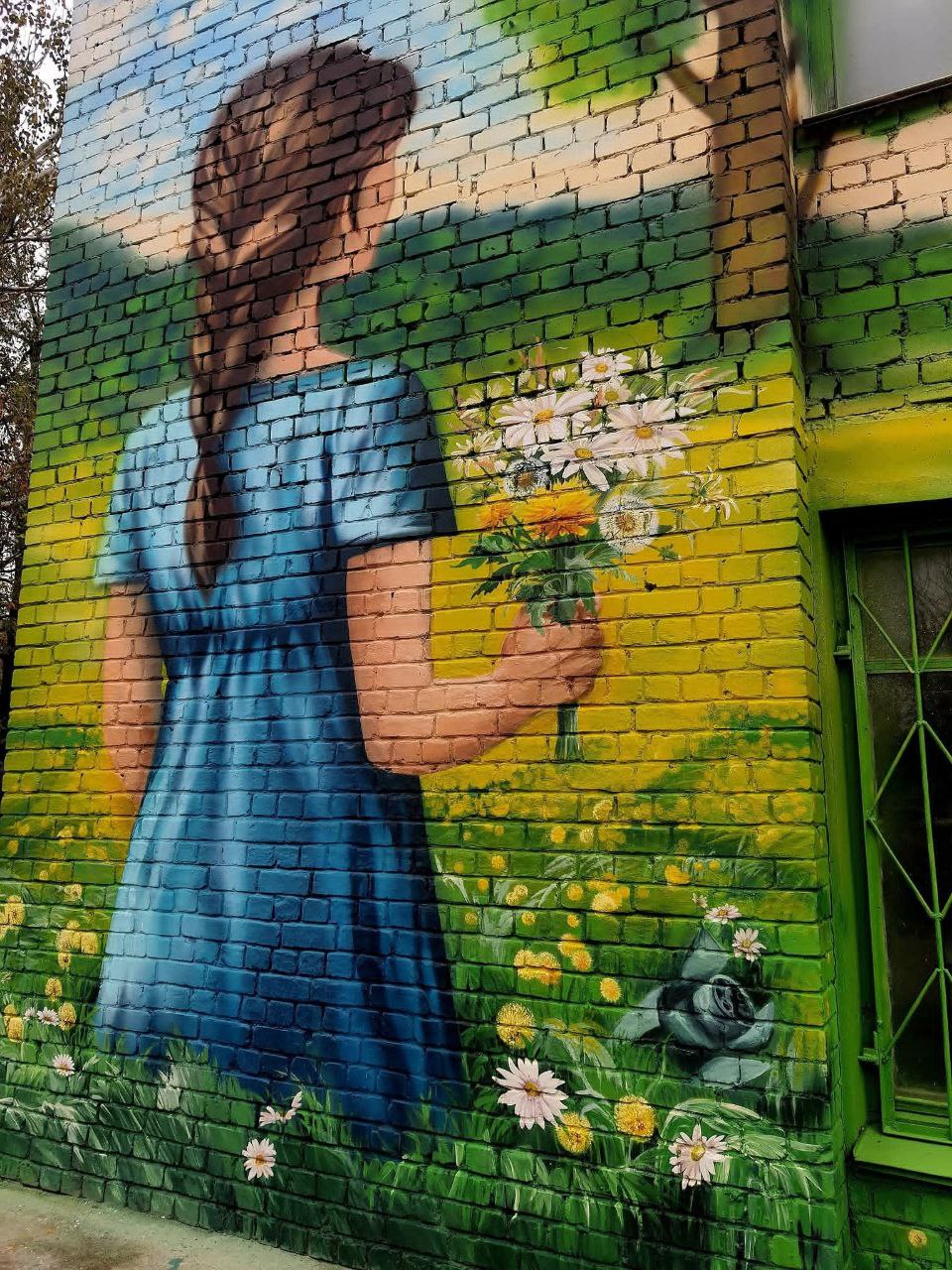 Новий мурал з’явився у Запоріжжі про дівчину, яка збирає квіти на острові Хортиця.