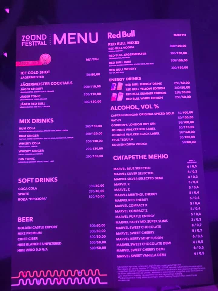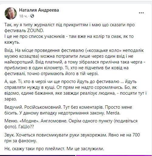 Так, ну я типу журналіст під прикриттям і маю що сказати про фестиваль ZOUND.І це не про список учасників — там вже на колір та смак, як то кажуть.Вхід. На місце проведення фестивалю («козацьке коло» неподалік музею козацтва) можна потрапити лише через один вхід і не найкоротший. Вхід платний, а тому зібралася прилічна така черга — приблизно в один кілометр. Ті, хто не підчепив би ковід на фестивалі, точно отримають його в тій черзі.А, ще. Ті, хто в черзі чи ще просто йдуть до фестивалю … йдуть справляти нужду в кущі. От прям не надто соромлячись. Бо, як відомо, єдине бажання, яке завжди реалізує людина, — посцяти тут і зараз.Ведучий. Російськомовний. Тут без коментарів. Просто мене бісить. У даному випадку недотримання закону. Merda.Меню. «Модне». Англомовне. Окрім одного пункту (подивіться фото). ГаШо??Звук. Хочеться повисмикувати руки звукорежам. Явно не на 700 грн за фанзону.Нє, скажу таки про плейлист. Ми це заслужили, — Наталля Андрєєва