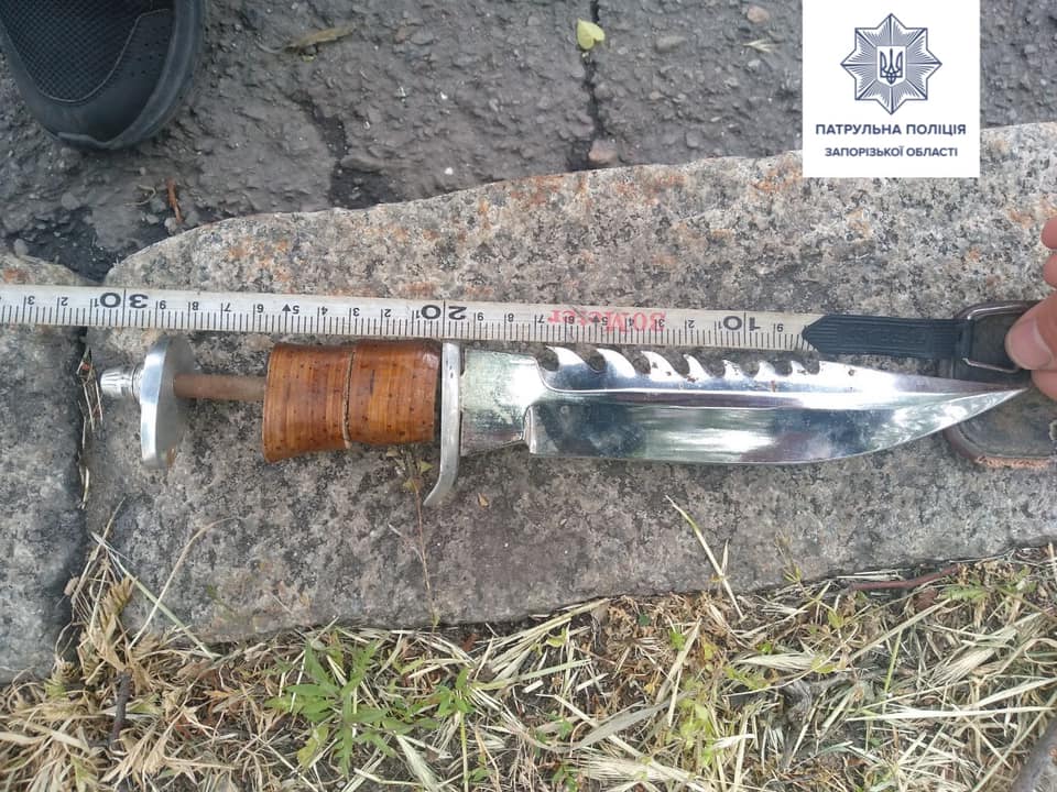 Ще один випадок зафіксували наступного дня по пр. Соборному. Згідно з орієнтуванням, інспектори зупинили BMW. Патрульні перевірили документи водія та провели перевірку автомобіля. В багажному відділенні виявили ніж, з ознаками холодної зброї.