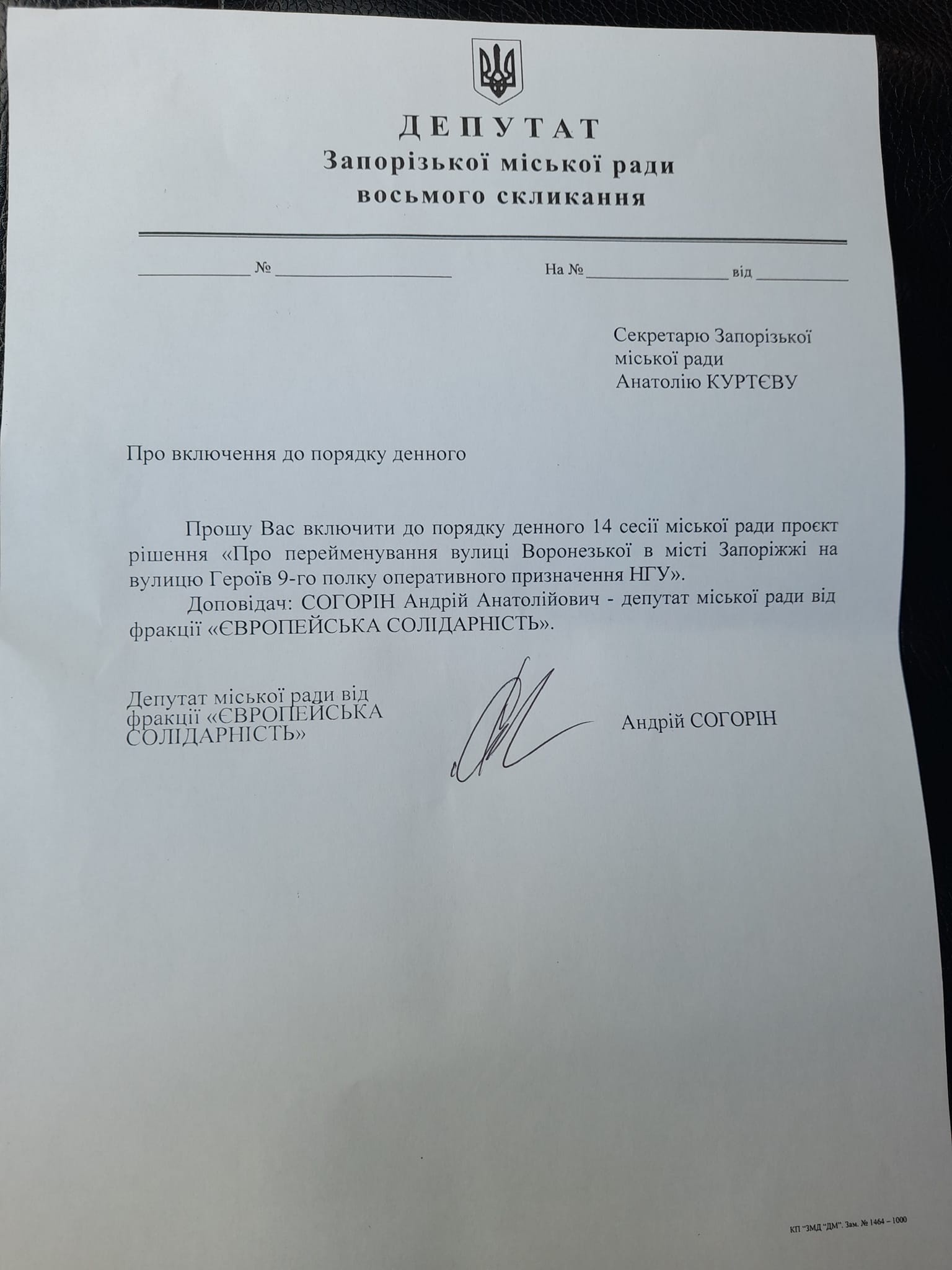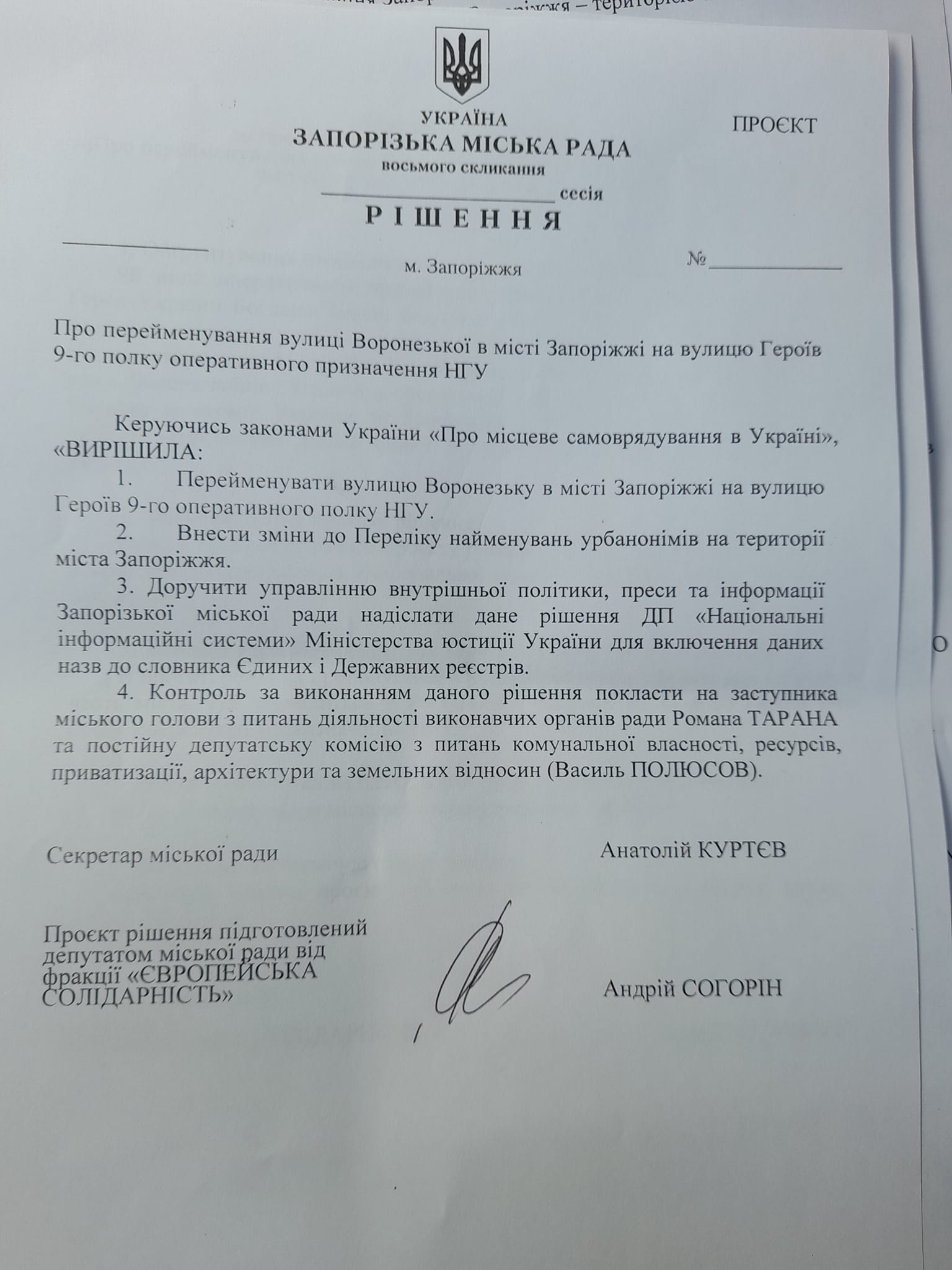 Отже, я підписав та передав на реєстрацію проект рішення на зміну назви вулиці Воронезької на вулицю Героїв 9го полку оперативного призначення НГУ.Буду просити колег намагатись пройти відповідні процедури та розглянути на найближчій сесії та просити підтримки, — зробив підсумок Андрій Согорін.