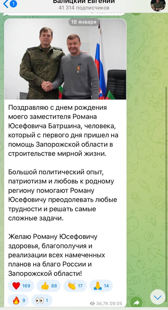Жодним чином на атаку і пошкодження московської церкви не відреагували і головні зрадники Запоріжжя та любителі скрєп – Євген Балицький і Владімір Рогов. Вчора в своїх соцмережах вони вітали з Днем нарощення російських бойовиків, а сьогодні виклали вітання з «Крєщенієм».